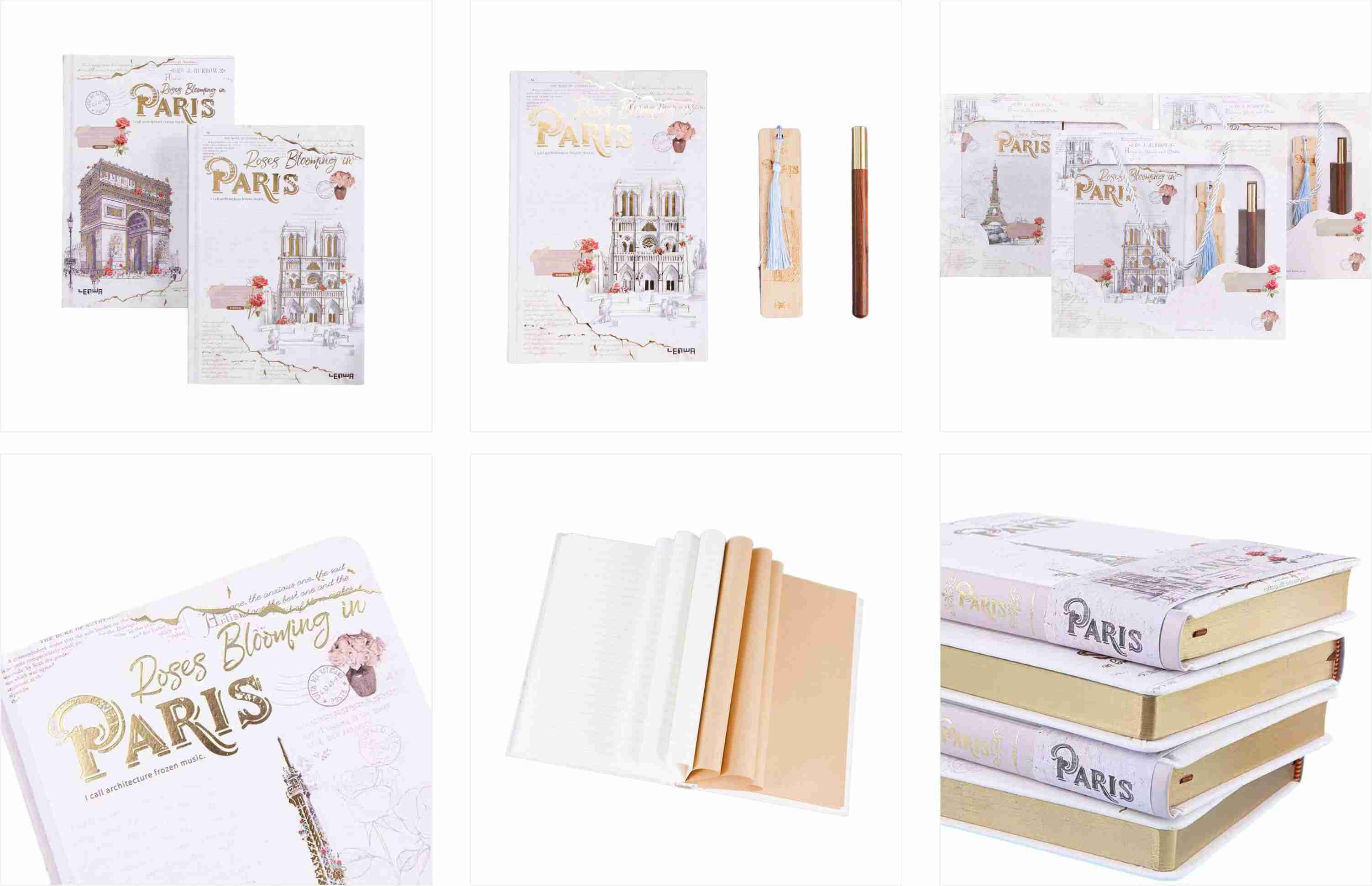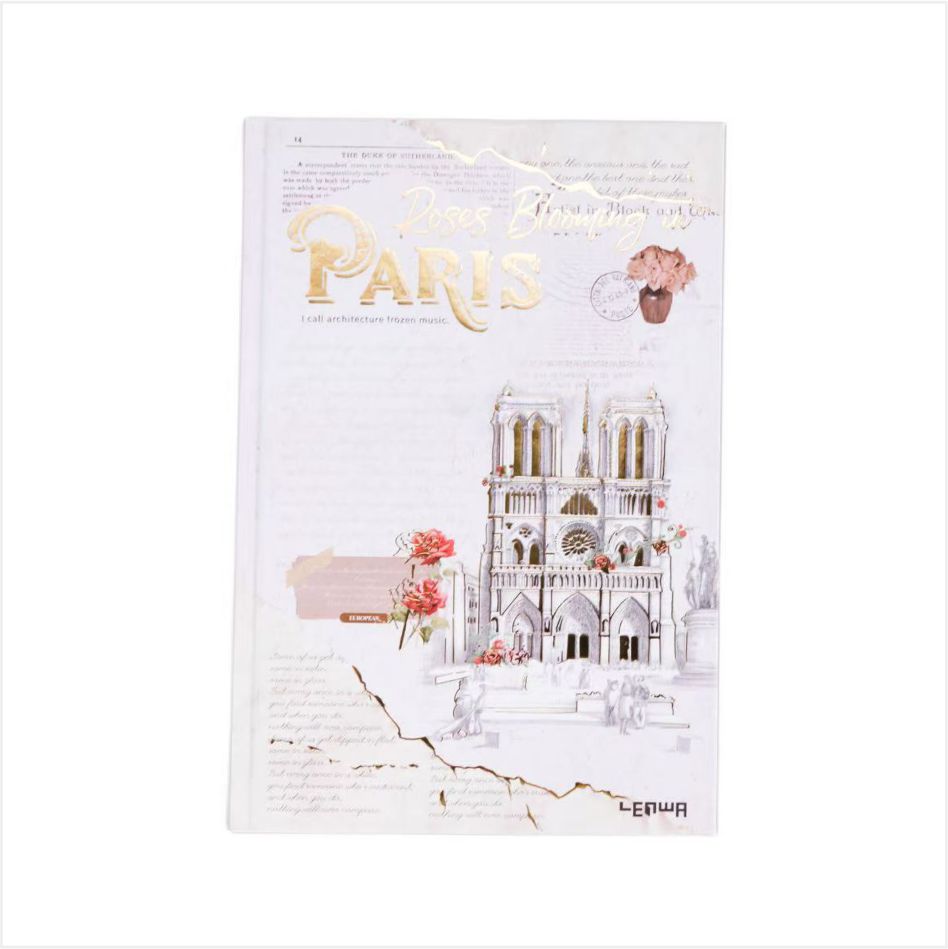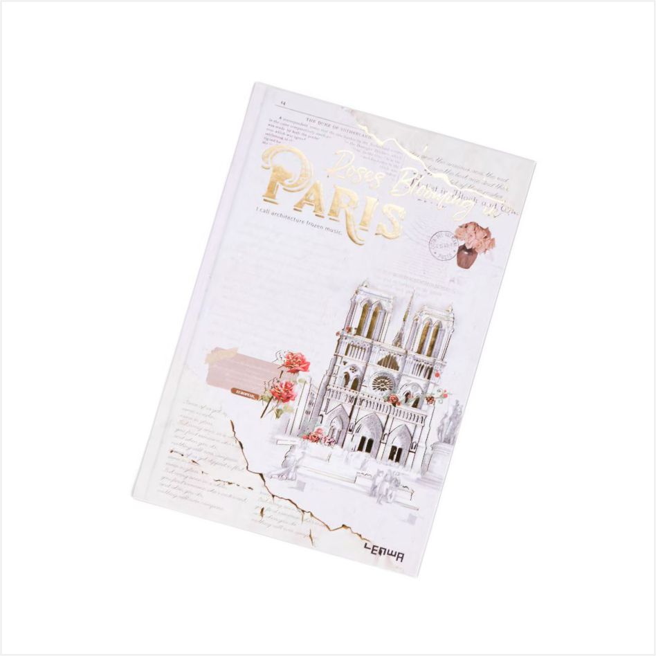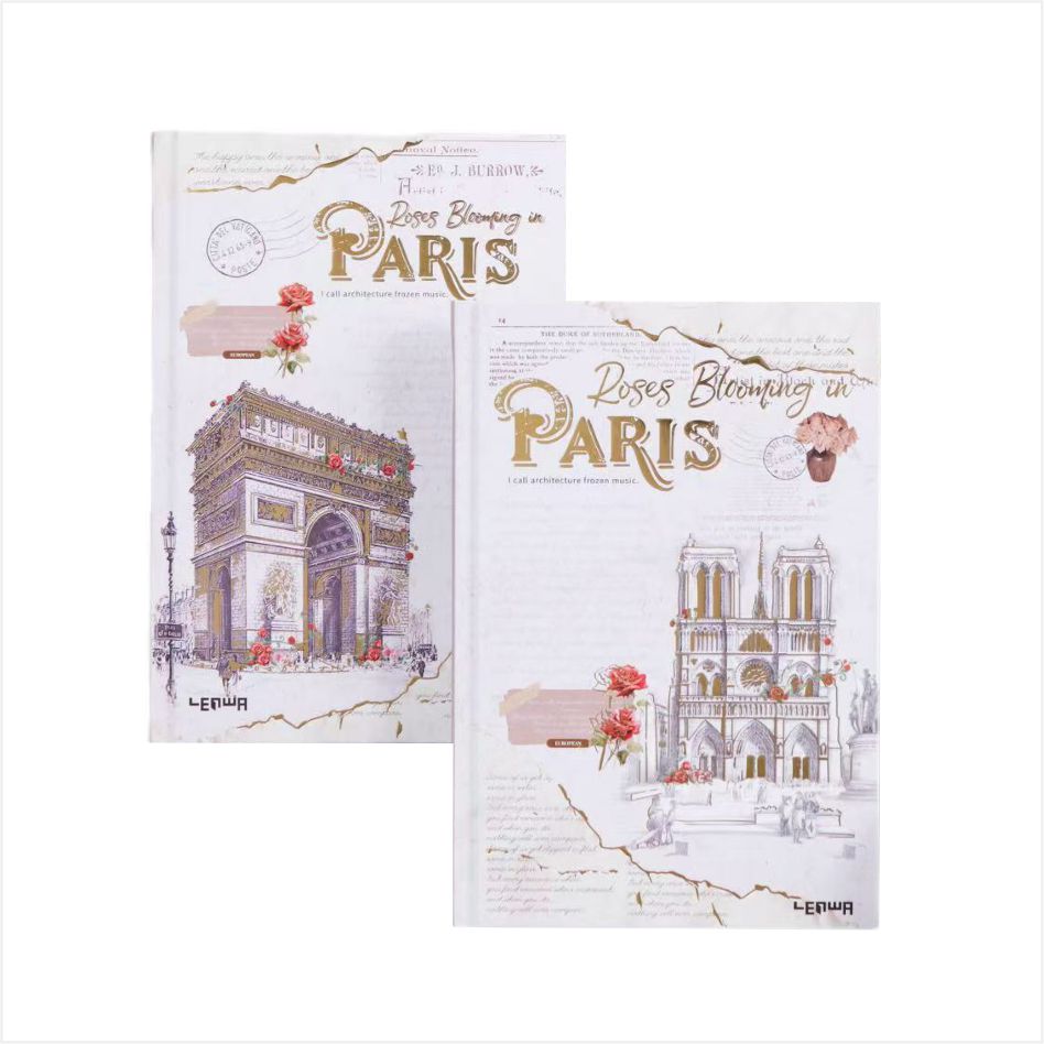 A capa apresenta edifícios icônicos como a Catedral de Notre Dame e o Arc de Triomphe, com rosas e elementos de carimbo vintage, exalando uma forte atmosfera artística. O quadro da página interna adota tecnologia banhada a ouro, acrescentando uma sensação de luxo. O design da linha horizontal é adequado para a escrita diária, e o papel de duas cores marrom-bege garante que a escrita seja suave e com tinta-seja um registro casual ou um diário, cada página é cheia de atmosfera.