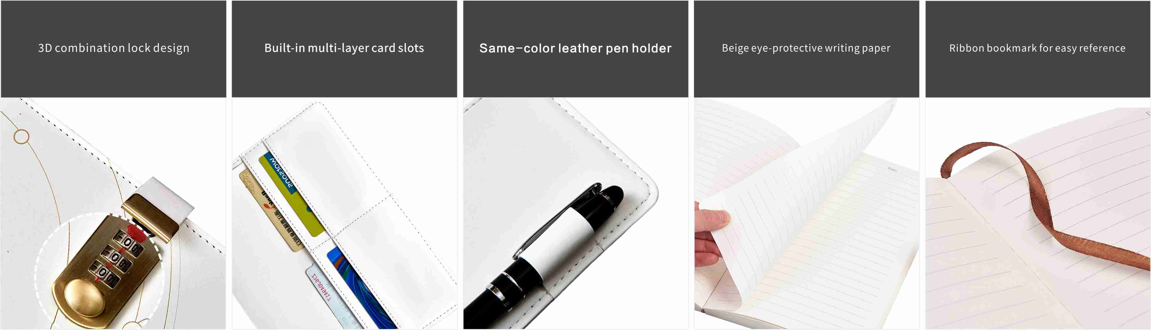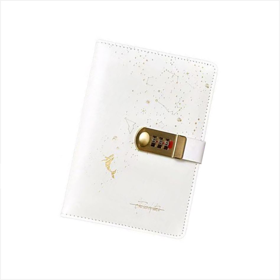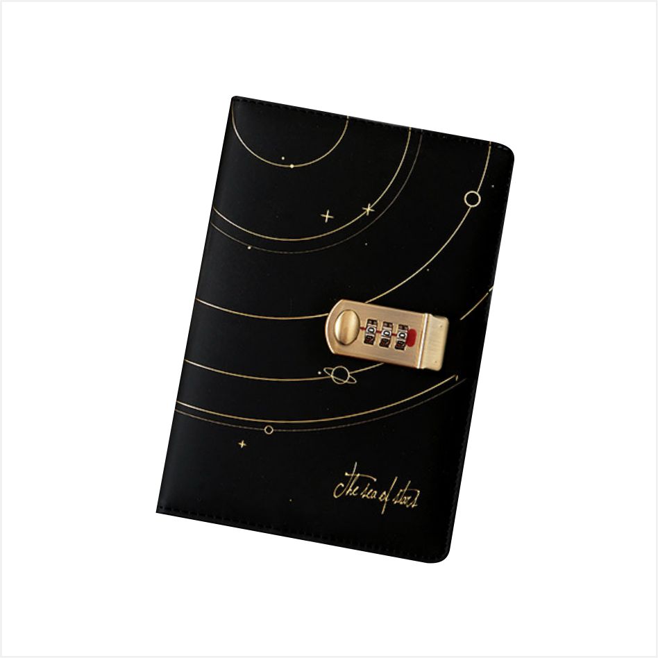 A capa deste diário com chave é feita de requintada tecnologia folheada a ouro, que delineia uma trajetória semelhante a uma órbita planetária com linhas simples, pontilhadas com pequenos pontos como estrelas, como se condensasse o misterioso céu noturno na imagem, silencioso e cheio de imaginação. É equipado com uma fechadura com combinação de metal dourado, controlada por uma senha de três dígitos. Você pode definir sua própria senha para garantir que somente você possa abrir o conteúdo.