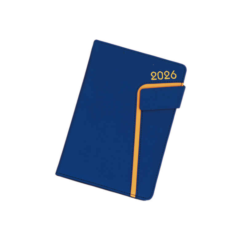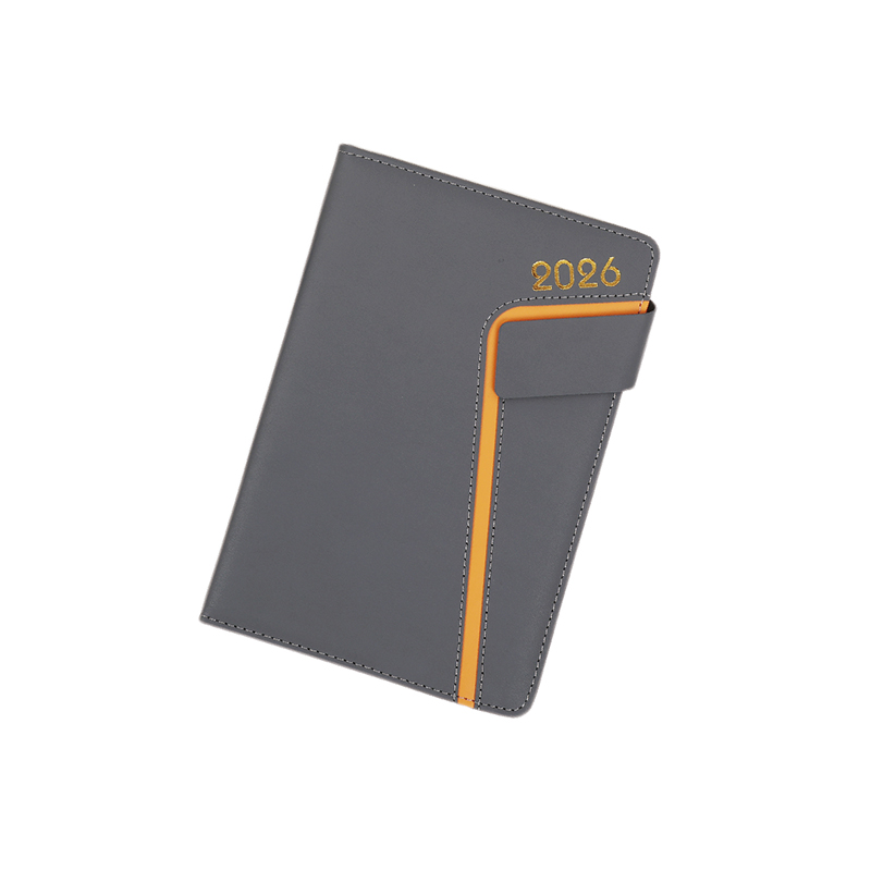 Este caderno alemão possui uma capa de couro PU com uma textura delicada, um logotipo 2026 banhado a ouro e uma linha laranja brilhante ao lado, combinada com uma fivela magnética da mesma cor, para um design simples e exclusivo.