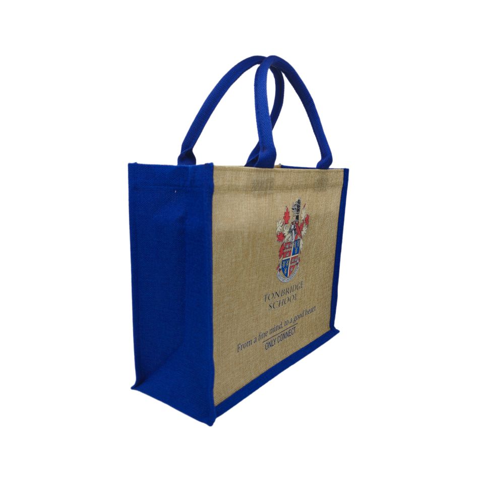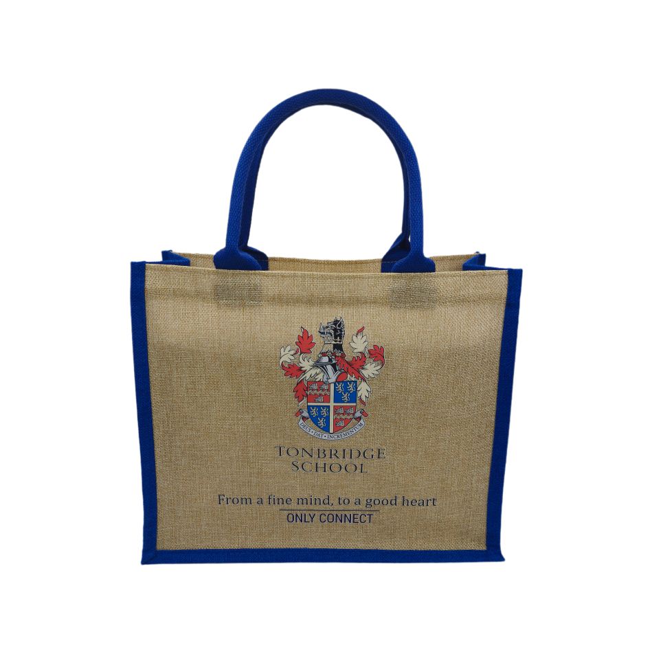 O tecido de linho é usado, forte e durável, borda e alça de bolsa azul, design de contraste de cores simples e atraentes, com crachás e slogans de estilo (Tonbridge School), únicos e elegantes, adequados para deslocamento diário e compras, com personalidade exclusiva.